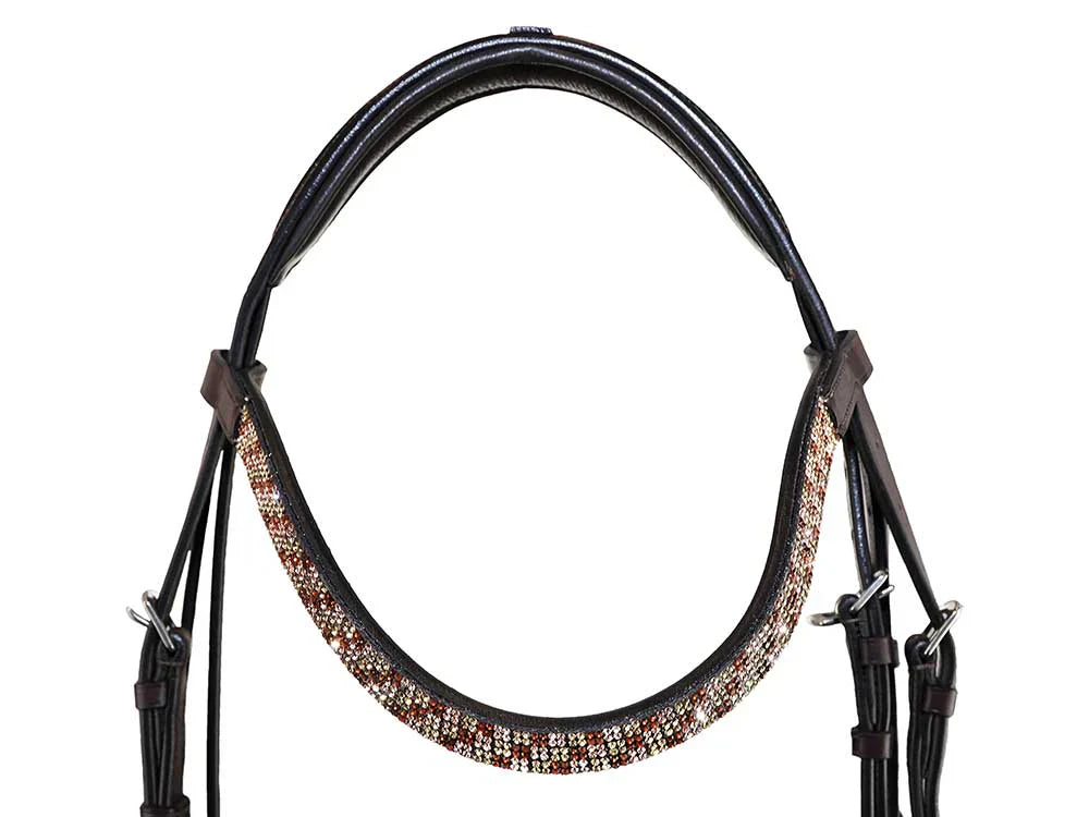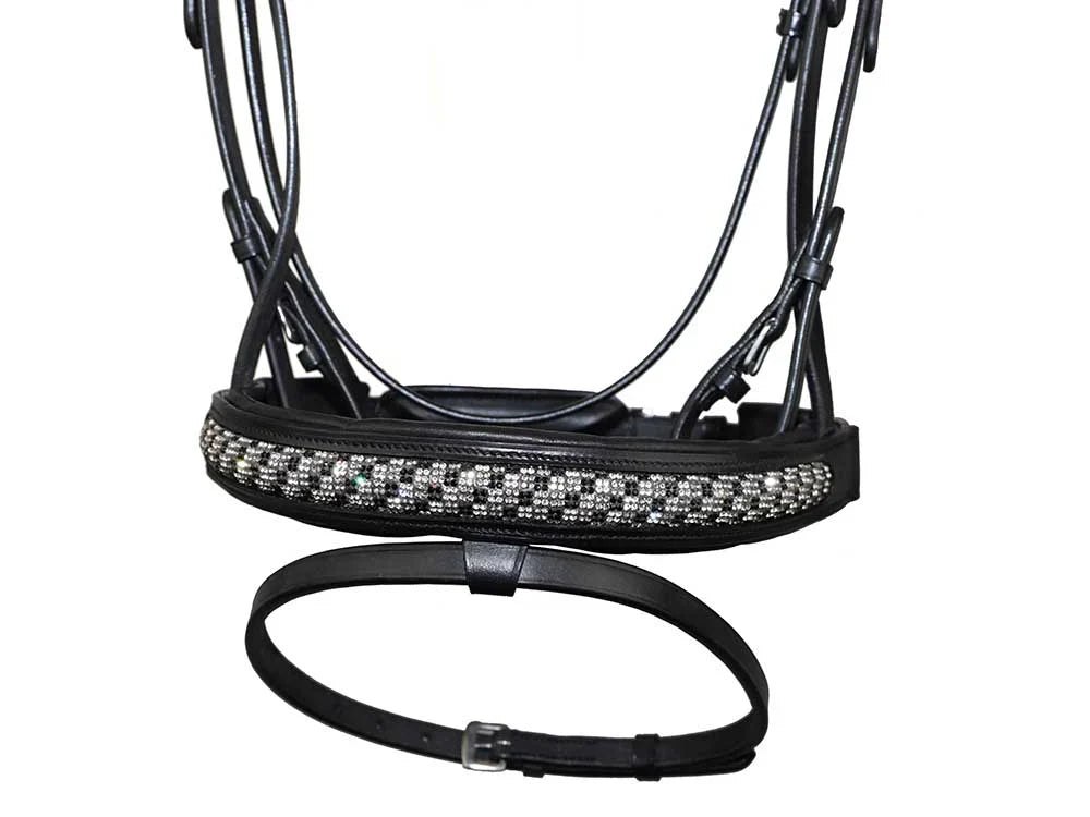 Our Bonn bridle features a beaded checkered design browband and noseband that sparkle and will make your horse stand out in a crowd. Made with premium, soft, supple leather with a padded crown and noseband as well as a flash attachment and stainless-steel hardware, our Bonn bridle is where functionality meets style. Black leather features black and white beads while Havana leather features rose gold and amber beads. Webbed reins with a non-slip grip are included.