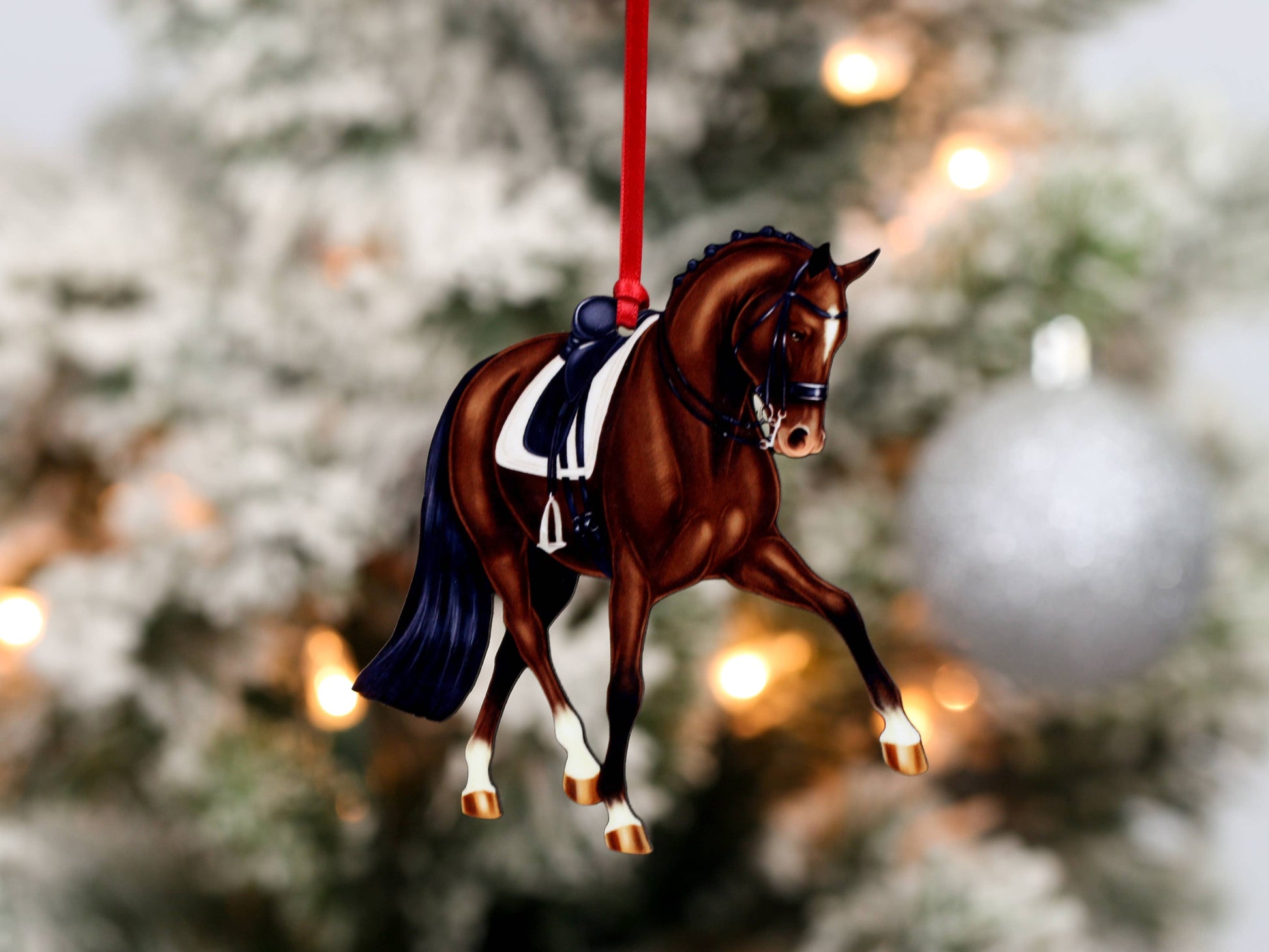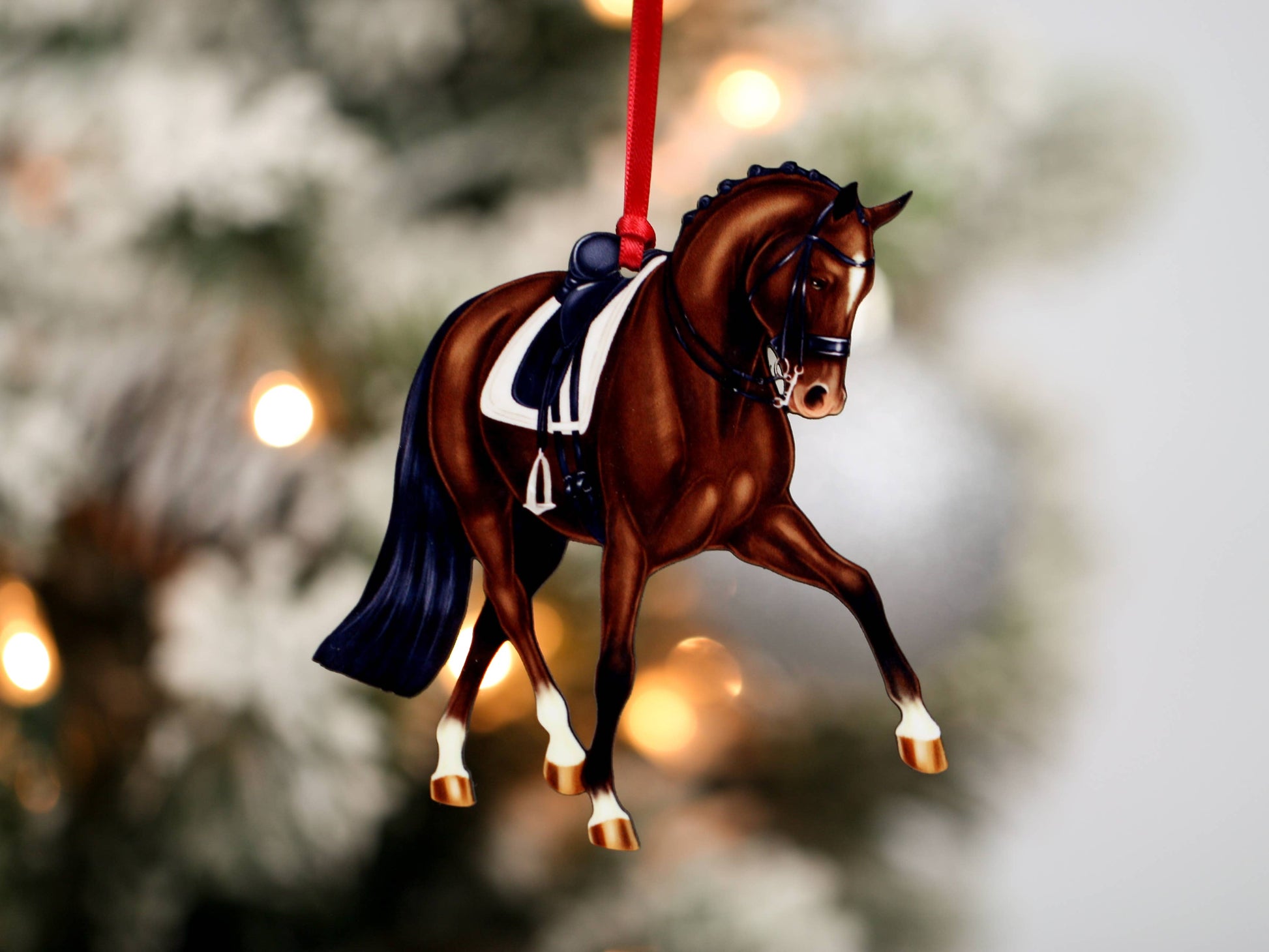 Here's a new half pass dressage horse ornament for display at Christmas and keep out on display for the year. Available in a variety of colors: bay (shown), dapple gray, chestnut and black. Feel free to request additional colors and coat patterns.