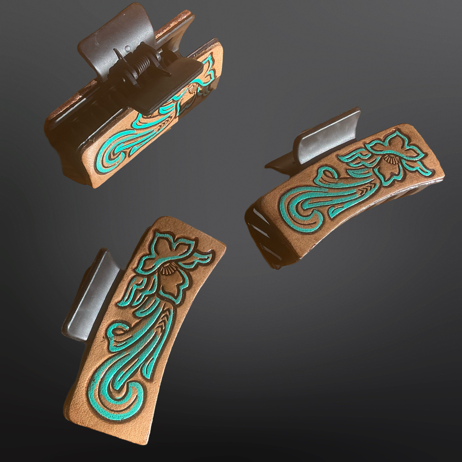 A very heavy duty claw hair clip adorned with our favorite material. A turquoise painte floral pattern on the front. Matte black clip.