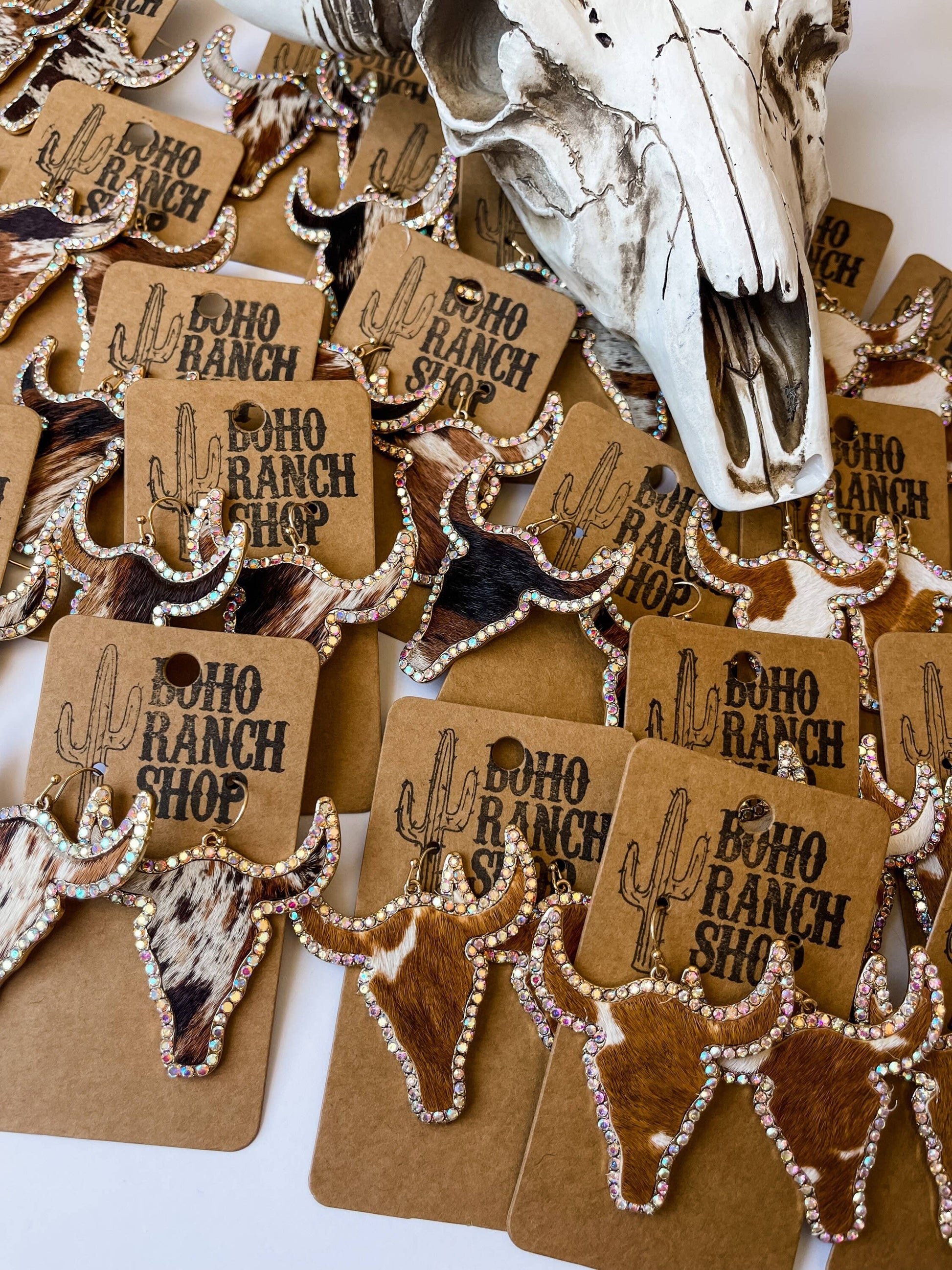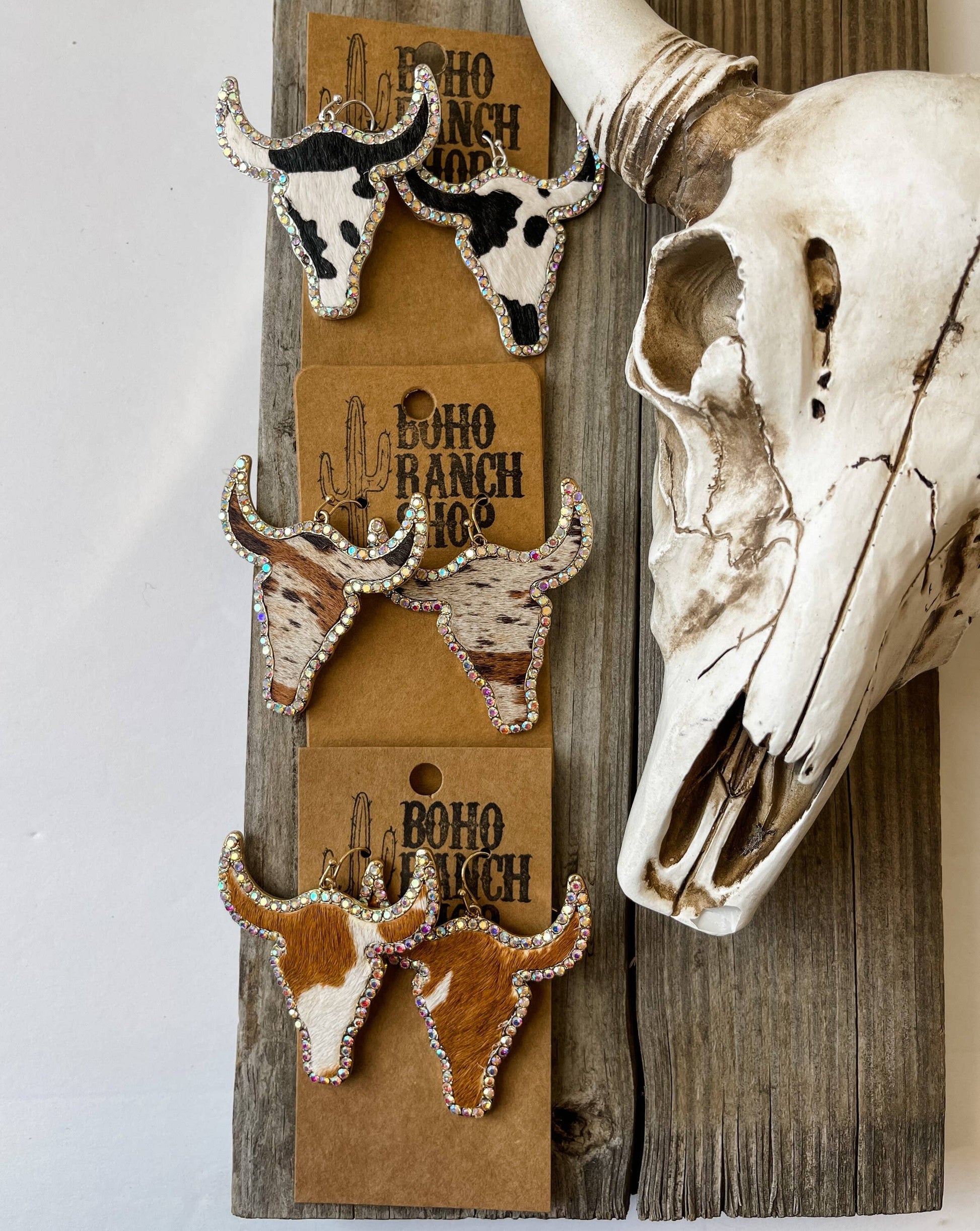 Cowhide Bling Earrings | Genuine Hair On Cowhide Cow Head Earrings | Longhorn Bull Steer Rhinestones Cow Print Southwestern Earrings Punchy